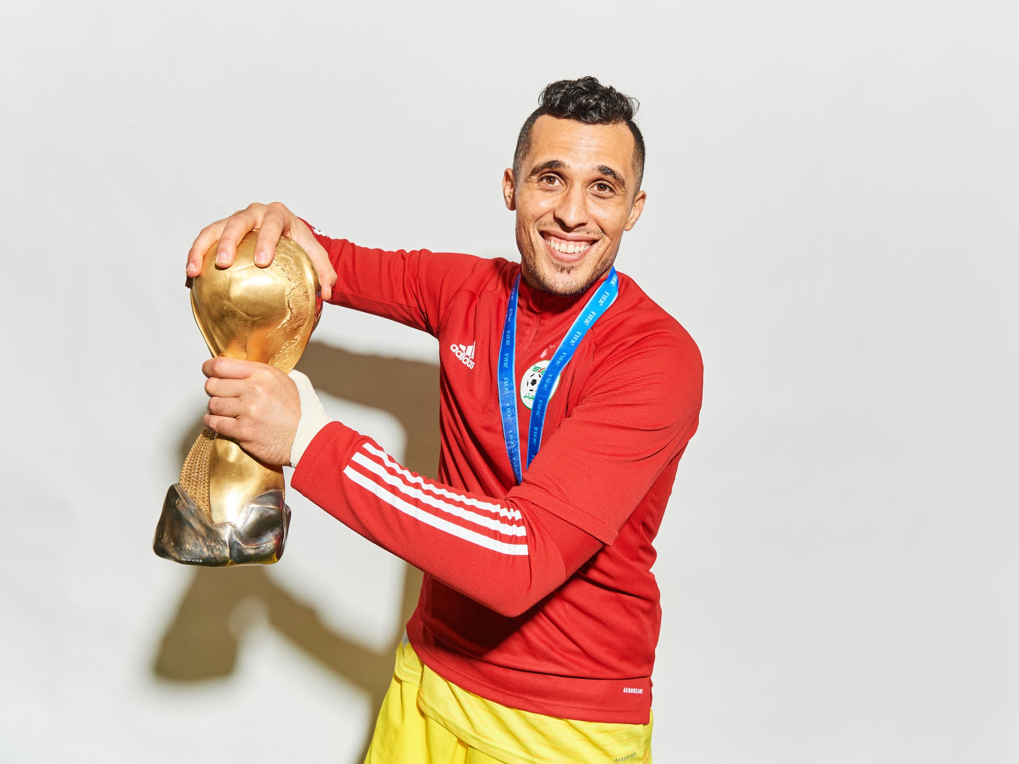 AL KHOR, QATAR - DECEMBER 18: Moustafa Zeghba of Algeria celebrates with the FIFA Arab Cup Winner's Trophy following the FIFA Arab Cup Qatar 2021 Final match between Tunisia and Algeria at Al Bayt Stadium on December 18, 2021 in Al Khor, Qatar. (Photo by Michael Regan - FIFA/FIFA via Getty Images)